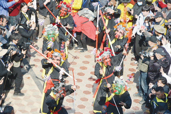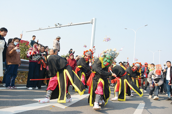 随着九声震天铳响,一支由上千人组成的巡游队伍从东汾五帝祖庙出发,开启绕村巡游之旅。巡游队伍以皂隶舞和棕轿舞开道,文武财神、踏马迎春、香担花担等特色民俗队伍紧随其后,一路浩浩荡荡,沿途观者人山人海,好不热闹。巡游队伍中,被列入莆田市非物质文化遗产保护名录的东汾皂隶舞表演,备受瞩目。该舞起源于唐代东汾傩舞,演变于明初,融合中原傩礼和闽越战舞,被中国《中国民族民间舞蹈集成·福建卷》认证为古代军傩活态遗存。表演者身穿黑衣红裤,佩戴傩面具,舞姿粗犷豪放,动作简单质朴,气势威赫,撼人心魄。
