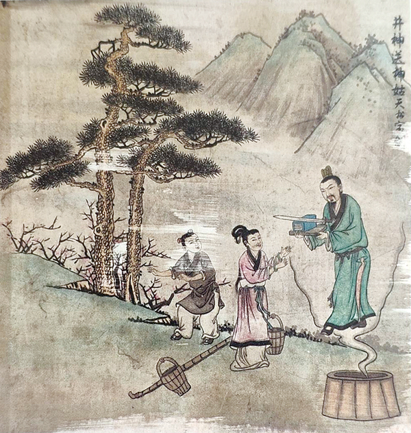 仙游县枫亭灵慈庙妈祖故事壁画中题记为“井神送神姑天书、宝剑”,画面取远山、古松为背景,描绘井神送给妈祖天书和宝剑的场景。前方右下角有一口井,井中冒出一团祥云,祥云上有人双手捧天书、宝剑,身着水红色衣饰的妈祖伸手欲接。跟随的民童惊吓欲离,放下手中扁担。作品综合了前几幅的故事情节和创作方式,形象处理稍显薄弱。以工写兼意的创造表现形式,构图以居中取势,松树位于画面的左上角,主要内容则偏右置入,整体的平衡走势全由那条分割线掌控,创意手法让人赞叹。