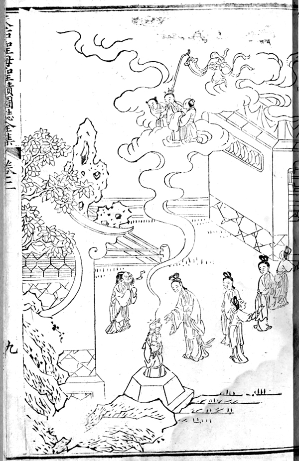 与《敕封天后志》中“窥井”描绘妈祖窥井得符的场景颇为近似。《天后圣母圣迹图志》中“窥井喜得灵符”取内庭院的一角,画面中间站立妈祖,其余略同。画面构图以居中取势法,将画面分割为上下两个部分,进一步扩大空间。人物刻画较为粗糙,但在祥云中加入神仙与神童。