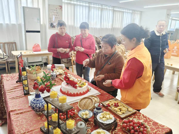 活动现场温馨而喜庆,在长者之家的活动区域内,一个点缀着新鲜水果和精美摆件的大蛋糕上格外醒目,长桌上摆放着象征长寿的精美摆件,精致的茶点和新鲜的果盘琳琅满目,长者们欢聚一堂,脸上洋溢着幸福的笑容,其乐融融。在热闹的氛围中,陈玉莺老人格外激动。她感慨道:“我这大半辈子经历了许多,没想到晚年能在筱塘社区长者之家和这么多老伙计一起过生日,还有这么多人关心,真的特别开心,感谢社区,感谢民政局!” 社区长者之家工作人员与志愿者们热情周到地陪伴在长者身旁,帮忙切蛋糕、与长者亲切交流。大家一同唱响生日歌,分享甜蜜蛋糕,现场欢声笑语,温情四溢。