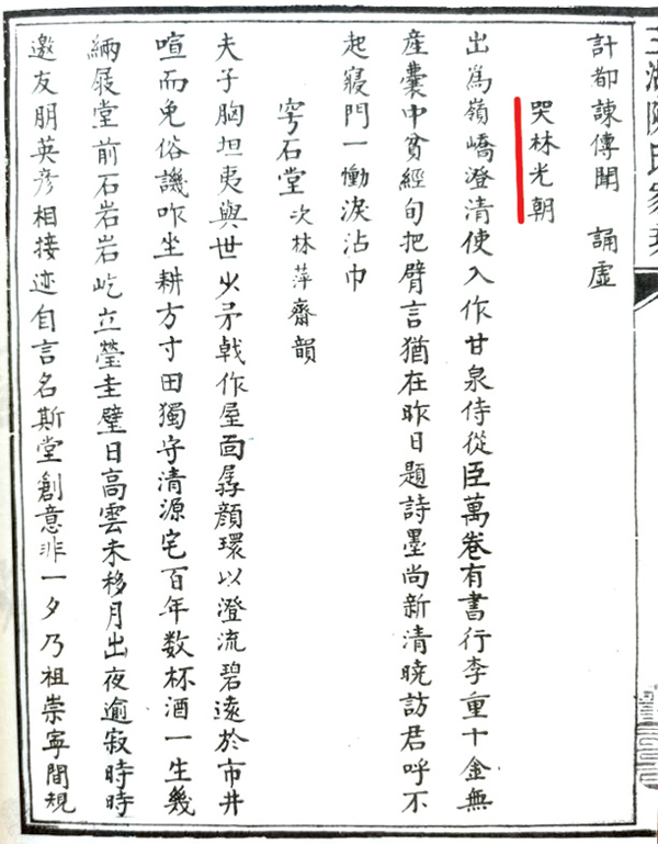 在莆田市图书馆,我查阅了《玉湖陈氏家乘》(第一册),里面收录莆人、名相陈俊卿《哭林光朝》诗一首,抄录如下: