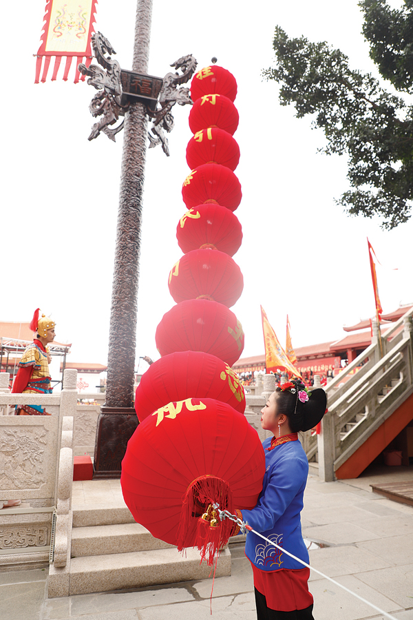 灯,是妈祖当年引导航船的红灯笼。挂灯衬托湄洲妈祖祖庙重大节日的喜庆气氛。红色的灯笼徐徐上升,激发人们增强战胜困难的信心。用妈祖的神灯指引人生的正确航向,祈求妈祖庇佑人们平安顺利、吉祥如意。