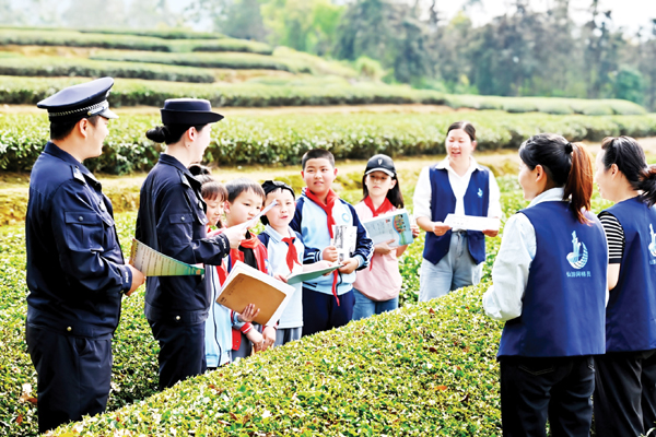 本报讯 近日,龙华镇新峰村百亩茶田里迎来了一群“小茶农”。龙华派出所联合龙华新峰小学组织小学生走进生态茶田开展“春茶研学”综合实践课。社区民警带领网格员团队化身“安全讲师”,在茶香四溢的田埂间构建起“防火红、反诈蓝、交通绿”三色安全课堂,让安全教育与自然教育深度融合。