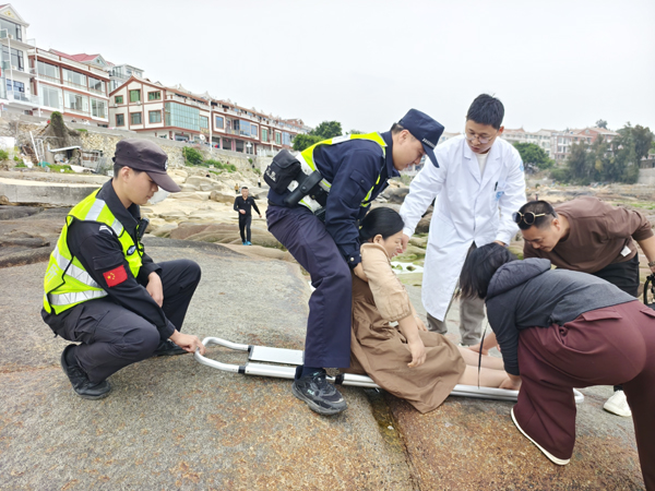 到达宫下村沙滩附近后,民警发现了受伤的游客彭某。彭某因在沙滩岩石上游玩时不小心扭到脚,正满脸痛苦地坐在地上,周围的人群面露担忧却又不知所措。