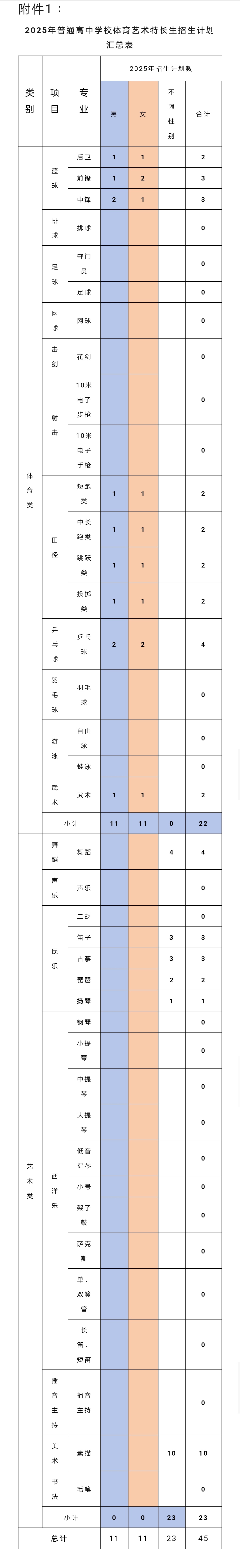 按照《莆田市教育局关于报送2025年普通高中学校体育艺术特长生招生计划的通知》(莆教体〔2025〕15号)文件的相关规定,招收艺体特长生共计45人。其中音乐13人;美术10人;体育22人。(具体专业和性别要求见附件1)