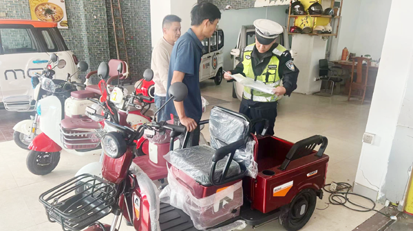 检查过程中,民警对各类电动车质量、外观标识、结构及主要技术参数等进行比对,检查在售电动车3C认证情况、是否有机动车整车出厂合格证和车辆一致性证书、是否存在非法改装及拼装电动车等情况进行详细检查。同时,要求店铺商家认真落实好企业主体责任,在销售过程中,切勿将手续不齐全、存有安全隐患的车辆投放市场,不可违法改装车辆,坚决禁止销售非标三轮电动车;加强对前来购买车辆群众的宣传工作,督促群众在购买车辆后及时办理上户手续,在驾乘摩托车、电动车时应当按规定佩戴安全头盔,遵守交通法律法规,提高交通安全出行意识。