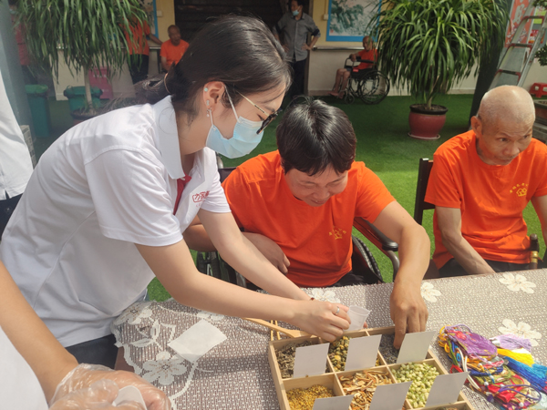 在制作香囊活动中,为老人们准备了艾草+菖蒲+香茅、薄荷+柠檬草+茉莉花、丁香+檀香+陈皮、玫瑰+薰衣草+桂花……各式各样的香料组合让老人们爱不释手,热情十足的挑选心仪的香料。在手工老师和志愿者的协助下,老人们用布料、丝线、香料等材料,制作出独特的香囊。“我选了玫瑰、薰衣草和桂花,做成花香满屋香囊,一个放在衣柜里散发香味,一个挂床头让房间增添一点香气”,院内李阿婆向志愿者分享道。“我选艾草、菖蒲和香茅做成传统的端午香囊,艾草香囊挂门上,跟老家习俗一样,驱邪纳福,挂门头迎吉祥,也像是回家了一样。而且可以佩戴在身上还可以驱虫祈福”,李阿公主动分享选香故事,活动现场充满欢声笑语。