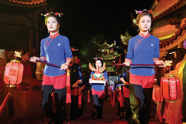 光影流转,湄洲妈祖祖庙天后艺术团、妈祖影视城《缘起湄洲》演艺团队带来的《快乐崇拜》《小城夏天》《万疆》等舞蹈节目轮番上演,演员们与现场的游客载歌载舞,一起欢庆妈祖诞辰1065周年,现场观众的掌声与喝彩声一浪高过一浪。