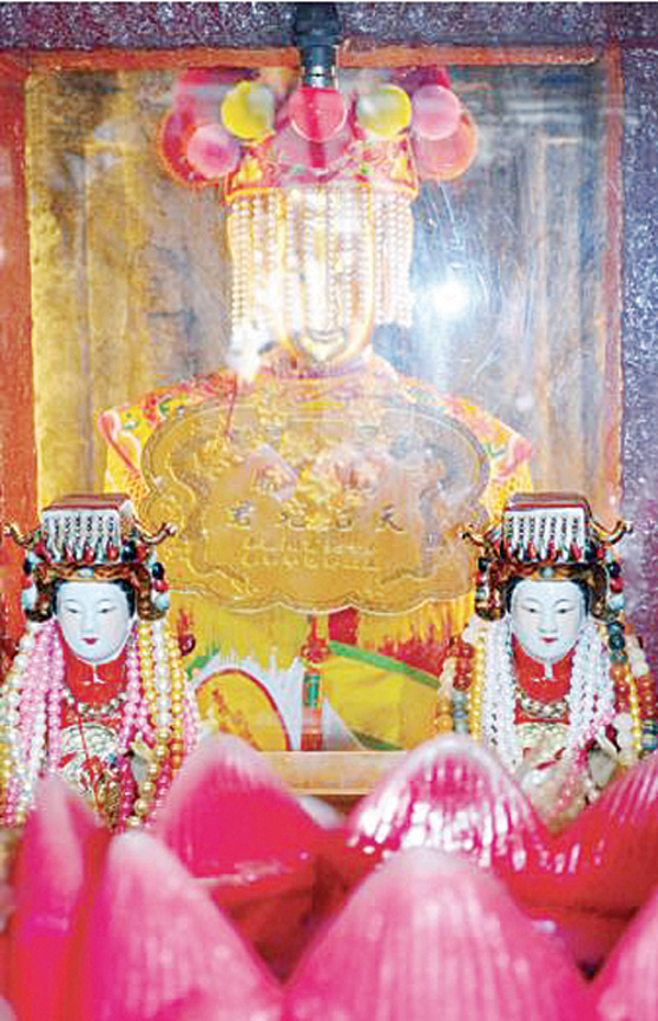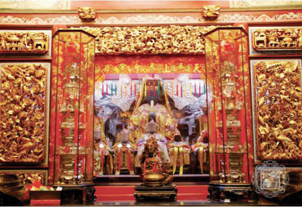 金面妈祖则是天神妈祖的代表,如台北金山慈濩宫、台南开基天后宫、澎湖天后宫等庙宇,其妈祖神像的脸部贴有金箔,因而称为“金面妈祖”,是道佛神祇的象征色彩,表现妈祖的神格尊贵庄严。多为官方设立的庙宇所供奉。譬如,澳门妈阁庙妈祖像,软身坐姿,金色面容,头戴冕冠,身着黄色龙袍,肩披黄色的云肩,双手合并置于胸前。自清代褒封妈祖为“天后”,妈祖的形象也随之发生变化,转变为双手执圭、头戴冕冠的高贵形象。视觉上,要求符合其身份、地位及神格,同时也要汲取民间生活源泉,以符合时代特征的信俗标准。