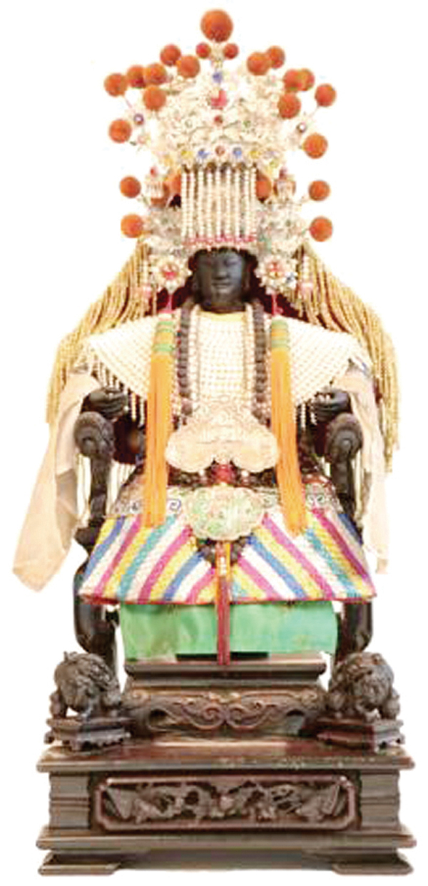 台湾彰化鹿港天后宫妈祖像,软身坐姿,乌面妈祖,面带微笑,头戴冕冠,冠两侧雕有凤的造型图案,冕冠与头部为同一块木材,双手执圭,身着黄色龙袍,外披黄色霞帔。