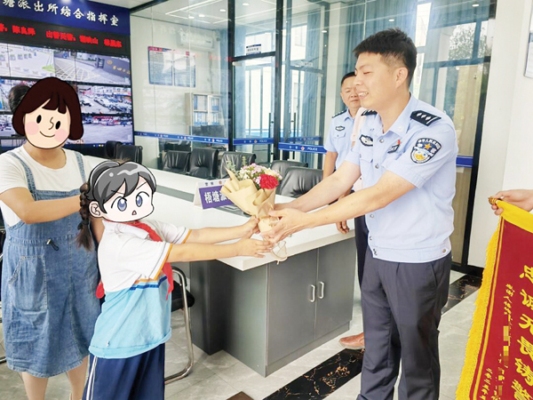5月22日上午,女孩一家四口人来到梧塘派出所,送来鲜花和锦旗,锦旗上写着“赴汤蹈火为人民·忠诚无畏铸警魂”感谢余警官危急时刻,冲进滚滚浓烟带孩子脱离危险……