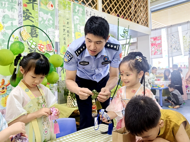 日,莆田出入境边防检查站团支部青年民警走进驻地南门幼儿园,与萌娃包粽子、做香囊、系彩绳喜迎端午佳节,共育传统文化,厚植家国情怀。