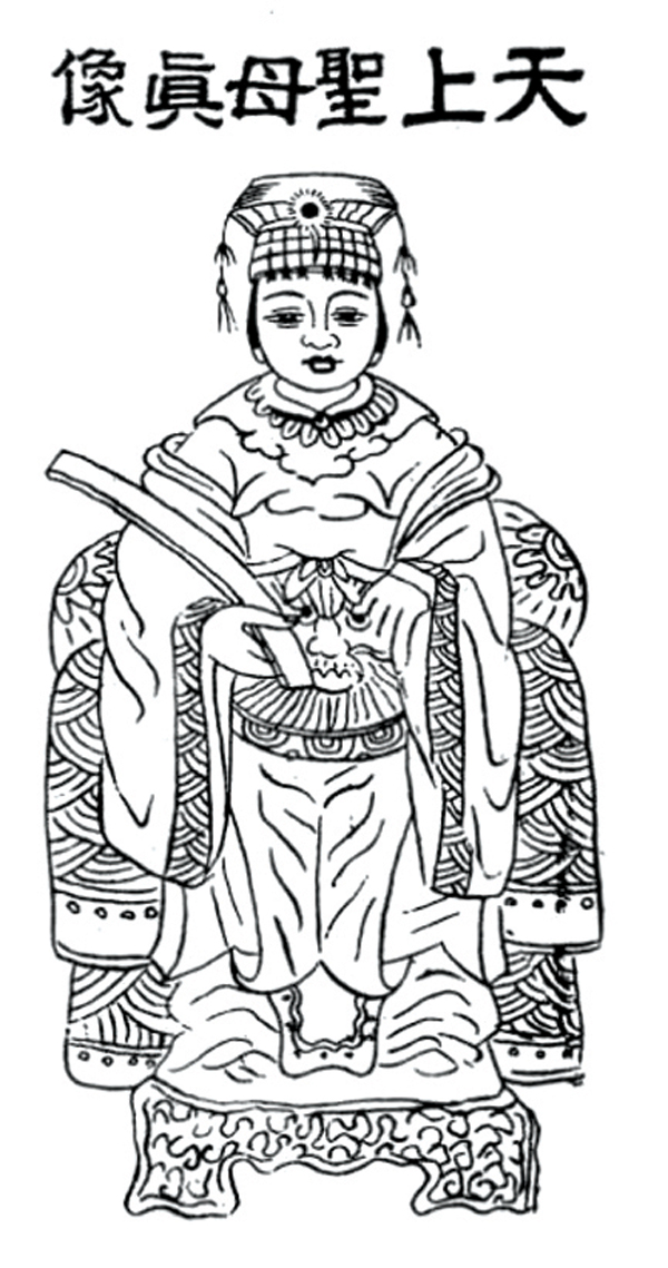 清末周宗坊刊本《勅封天后圣母真经》为地方所印经书。书的封面上,妈祖头戴冕旒,手捧宝圭。侍者头戴翘角濮头,手持宝扇。线条概括,有粗犷简放特征。