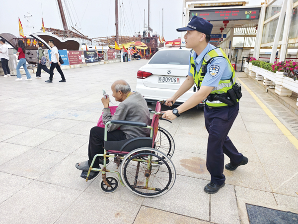 本报讯 日前,湄洲派出所民警林一凯在开展执勤安保工作时,敏锐发现在宫下圆圈公交站台上,一位老人独坐长椅、面露愁容。上前询问得知,老人因手脚行动不便,难以自行前往轮渡码头乘船出岛,正为出行难题焦急不已。