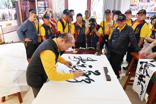 午后,台湾谒祖团在福建省同心文化推荐官林忆媚的引导下参观了东进村非遗文化展览馆。清代《五帝回鸾万民庆》、隋代砖以及两岸往来文书等10件文物,实证了“人同根、神同源”的文化联结。在“同根共祈”互动环节,莆台书法家联袂创作了“五帝道统 肇始东汾”“同根共祈”“神缘福禄寿”等墨宝,台胞们亲笔签署五帝祈愿文书,共祈平安,体验了传统文化的魅力。
