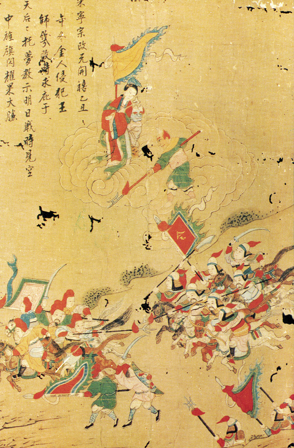 《妈祖文献资料》第11页中宋丁伯桂《顺济圣妃庙记》载:“开禧丙寅,金寇淮甸,郡遣戍兵,载神香火以行;一战花黡镇,再战紫金山,三战解合肥之围。神以身现云中,著旗帜,军士勇张,凯奏以还。”南宋抵抗金兵入侵的三次战斗,军士们随身携带妈祖香火神符上阵迎击金兵,两军交战,士兵声称看见妈祖现身云间,挥舞军旗助战,一举解了合肥之围并取得胜利。清代《天后圣母事迹图志》之“助阴兵金人碎首”、清代《天后显圣故事图轴》的设色画面中,宋将利用水师官兵敬仰妈祖的心理鼓舞士气,使其奋勇作战。《妈祖文献史料汇编》第94页中《天妃显圣录》之“平大奚寇”记载:“与贼遇于中流,彼居上风,难以取胜。众祷于神曰:‘愿藉神力扫妖氛,上慰天子讨叛之心,下救万民蹂躏之苦。’顷刻间昏雾四塞,返风旋波,神光赫濯显现。”宋景定三年(1262),海寇作乱于兴、泉、漳之间海城,官兵得到妈祖神助,在莆田湄洲一带海域擒获海寇。