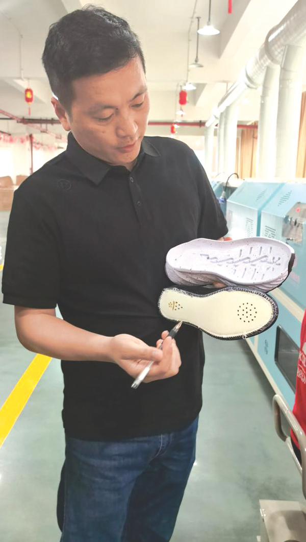 ▲鲸动科技(莆田)有限公司总经理陈珍灯为记者介绍“鲸动呼吸鞋”