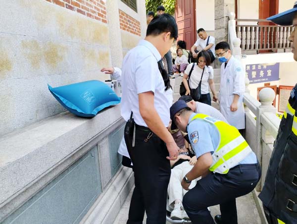 本报讯 5月2日,一名患有高血压的老人游客在祖庙游览过程中,突然中暑晕倒在地。正在附近巡逻的民警王坚章敏锐察觉异样,迅速赶到现场。只见老人面色苍白、意识模糊,情况危急。民警立即联系祖庙卫生所,请求专业医护人员前来支援。同时,拨打120急救电话,并协调路面骑警待命,准备为送医车辆开道。