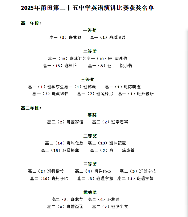 本次演讲比赛不仅点燃了同学们学习英语的热情,更搭建了一个展示才华、锻炼表达能力的宝贵平台。通过用英语讲述中国故事, 同学们深化了对中华文化的认同,增强了文化自信,提升了用国际语言传播中国声音的能力。这场融语言能力、思辨素养与文化传承于一体的赛事,为莆田第二十五中学的校园文化生活增添了亮丽的一笔。期待未来有更多学子站上这个舞台,用英语架起沟通世界的桥梁,让世界听见更加嘹亮的中国青年之声!