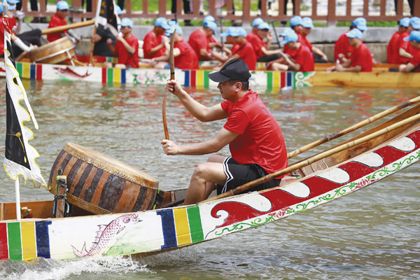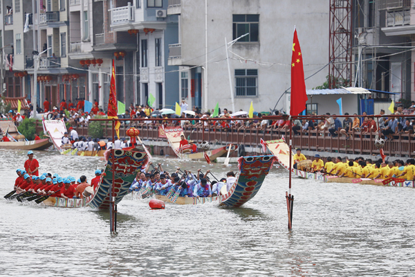 5月31日(农历五月初五)下午,位于荔城区黄石镇东甲村的二洋沟两岸人头攒动,鼓声震天,一年一度的端午龙舟教渡在这里举行,十多艘龙舟在沟面上来回穿梭,舟上的健儿们随着锣鼓声的节拍,挥动着手中的船桨,齐心协力向终点飞快划去,岸边围观群众的加油声和呐喊声,一浪高过一浪,大家在健儿们的“速度与激情”中,感受龙舟文化的非凡魅力。(时报记者 翁志鹏)