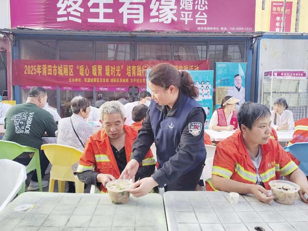 本报讯 每当晨光微熹,橙色的身影已穿梭在大街小巷,他们在大街里、公路上,拿着大扫帚清扫着路面上的垃圾,或是手握高压水枪冲洗着路面污垢,以实际行动守护着公路整洁畅通、城市美丽容颜。虽然他们的工作很平凡,但他们的职业值得尊重!近日,城厢区龙桥街道太平社区文献广场上,一口大锅咕嘟作响,卤汁的醇香裹着腾腾热气飘散开来。太平网格员将一碗碗盛着油亮的五花肉、海蛎、花蛤等莆田大海的味道,递到刚结束清扫的环卫工人手中,他们吃着暖心的卤面,一脸开心。