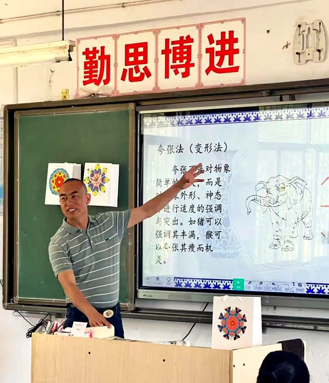 活动中,来自秀屿区毓英中学的黄荣春老师率先授课。他凭借精心设计的教学环节,引导学生深入理解纹样设计的原理与技巧。荣春老师带来了各式各样形式的材料与南日中学学生们合作完成各式各样的作品。课堂氛围活跃,学生参与度高。