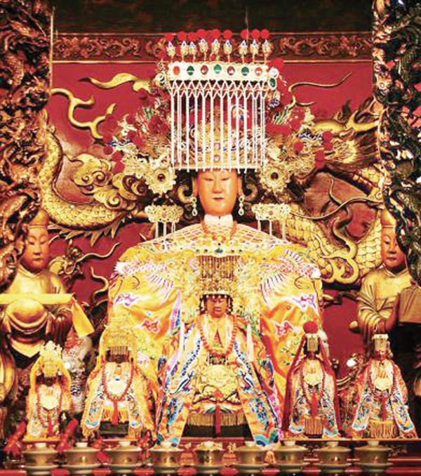 台湾大甲镇澜宫妈祖像,软身坐姿,面部丰满祥和,凤眼俯视前方,头戴十二旒冕冠,冠体较宽,身着黄色龙袍,肩披珠编云肩,外披黄色霞帔。双手盘靠、十指互拱,并列放置龙椅之上。神像双眼垂睑下望有慈悲、内敛的气质,左右随侍的是她的侍女。据说二次大战期间,盟军丢下两颗炸弹在大甲街上,一颗炸断火车站一带;一颗未爆弹落在妈祖庙旁的市场边,当时镇殿妈祖手脚身体都可以自由转动,其双手是张开的,民间流传是镇殿妈祖显灵接炮弹,才使镇澜宫城内一带没有受到炸弹损伤。