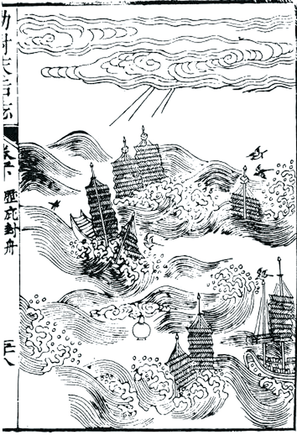 明宣德六年(1431)春朔,正使太监郑和、王景弘等人立《通番事迹之记》碑,文载:“值得险阻,一称神号,感应如响,即有神灯,烛于帆樯,灵光一临,则变险为夷,舟师恬然,咸保无虞。”其生动地描述七次出使西洋的经过,以纪念海神妈祖引航护佑的恩德与功绩。林嵋《天妃显圣录序》载:“及其升化,燕集于舟,蜂翔于水,紫衣明烛,救世现身。……俄而奇鸟集于樯杪,翠羽笼云,宛若翔鸾,舟赖以济。”林嵋,字小嵋,明崇祯十六年(1643)进士。抗清失败后,不屈自杀。《闽书·方域志》载:“其后,成化中给事中陈询使日本,嘉靖间给事中陈侃使琉球,值风船危,率有灵护,或见红灯从天而下,或有粉蝶绕樯而飞。”随着妈祖信俗不断传播,世人开始将海上航行中的许多物象和妈祖传说故事进行结合,从而产生新的神佑故事征象。以蝴蝶、神鸟、神风的物象符号喻指妈祖显灵,传达出渔民对妈祖的敬仰之情。明郎瑛《七修类稿》中“天妃显应”载:“明日有粉蝶绕舟飞不去,黄雀立舵食米,食尽,顷刻风又作,舟行如飞,彻晓至闽,午后入定海也。神实不可掩也。”