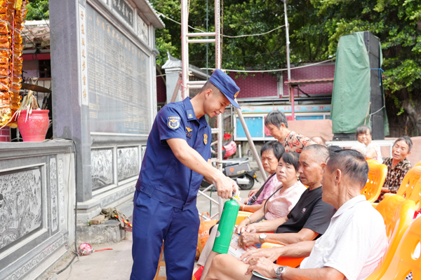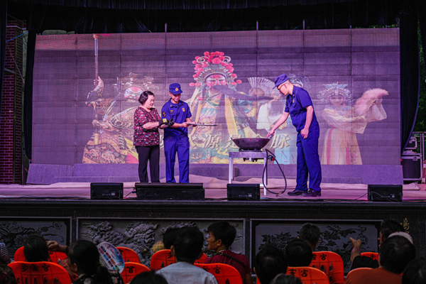 现场,消防宣讲员还结合展板用方言为老人讲解祭祀香烛、卧床吸烟等隐患,反复叮嘱“三清三关”的必要性。戏前15分钟,消防宣讲员到台上演示灭火器使用和油锅灭火,并邀请观众参与体验。返乡大学生志愿者携手“火焰蓝”跑团向村民发放宣传单,还深入后台对演员讲明“人走断电”“禁烟禁火”等防控知识点,多形式提升防火意识和应急能力。