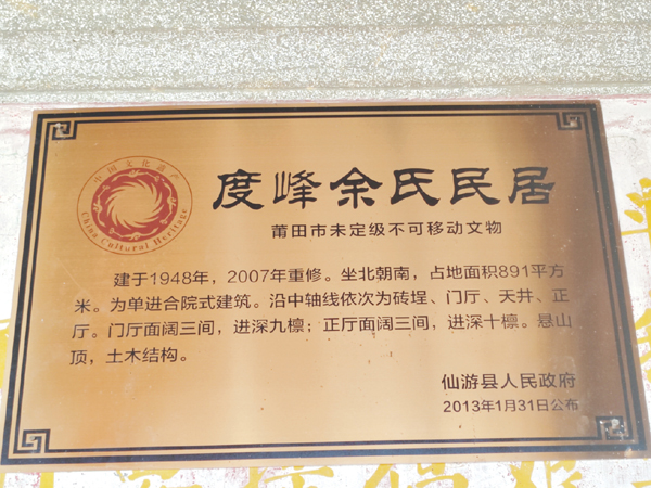 在莆仙民居中,每一座老宅大院都隐藏着一个家族旺盛的故事,都满含着一段历史与耕读文化的印记。位于仙游县度尾镇度峰社区的一座余氏民居,据说当时用了76斤黄金修建而成的大宅院。这座大宅院建成于1949年,古韵绵长留乡愁,诉说着悠悠岁月的家国情怀,维系着三代侨人漂洋过海、双向奔赴的深情故事。