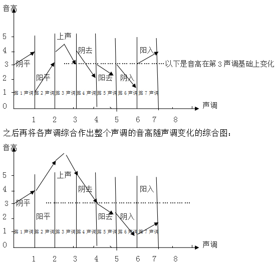 上图便是整个莆仙话声调中的音高随声调变化综合图,也是体现整个莆仙方言声调的音高随声调变化包括普通话声调在内的一个特征。