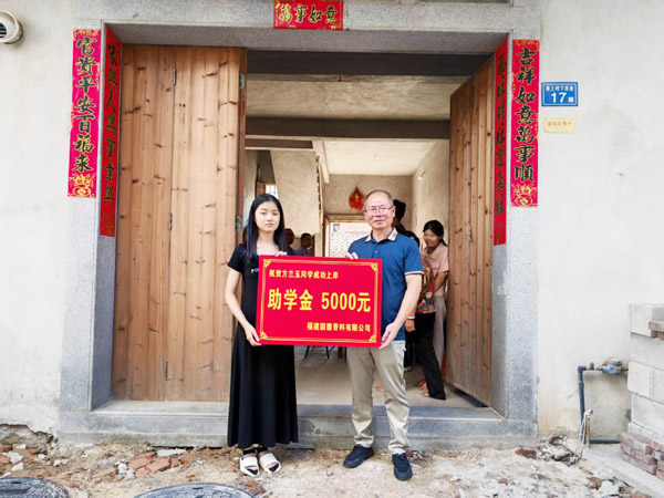 方文增常务副会长代表福建固德香料有限公司送去助学金,祝贺方兰玉同学成功上岸。