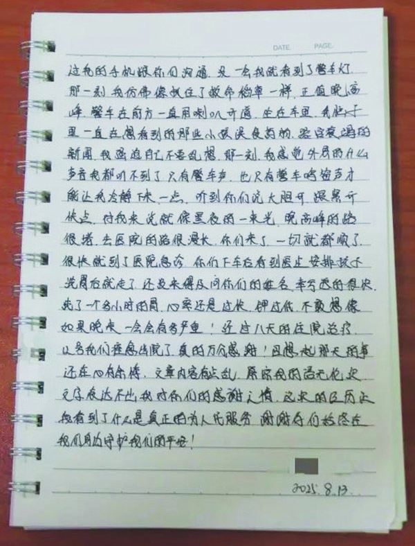感谢信的最后这样写道:“这次的经历让我看到了什么是真正的为人民服务,谢谢你们始终在我们身边,守护我们的平安!”