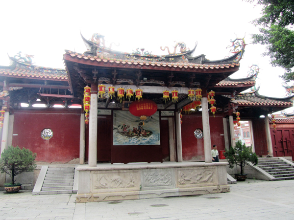 大殿的屋顶脊中段有玻璃瓦和五彩瓦片粘成的双龙戏珠;脊端和重檐之间雕彩各种飞禽走兽、花卉人物,栩栩如生。殿前有一对青草石雕龙柱,据传系郑成功宿校师徒二人所制,二龙飞腾,搏浪驾云,巧夺天工。门前侧立着两尊石狮,威武传神。