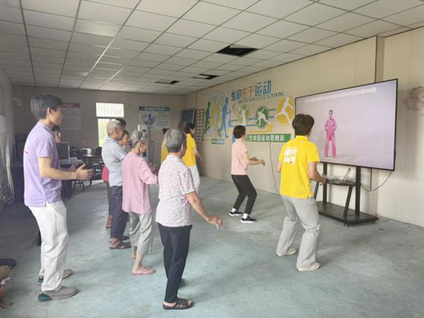 上午十点,伴随着悠扬的《行云流水》古琴曲,志愿者列队展演八段锦。“调理脾胃须单举”、“双手托天理三焦”……一招一式刚柔相济,舒展的动作与舒缓的音乐相得益彰,吸引了众多村民驻足围观。81岁的林阿公忍不住跟着比划起来:“这比广场舞轻松,练完浑身舒坦!”展演结束后,志愿者们分组带领村民学习基础动作。他们摒弃专业术语,用“抬手像摘果子”、“弯腰似拾麦穗” 等充满乡土气息的生活化比喻讲解动作要领,现场笑声不断,学习氛围格外融洽。