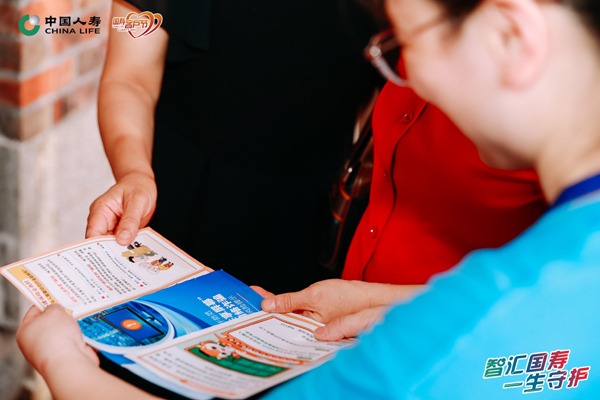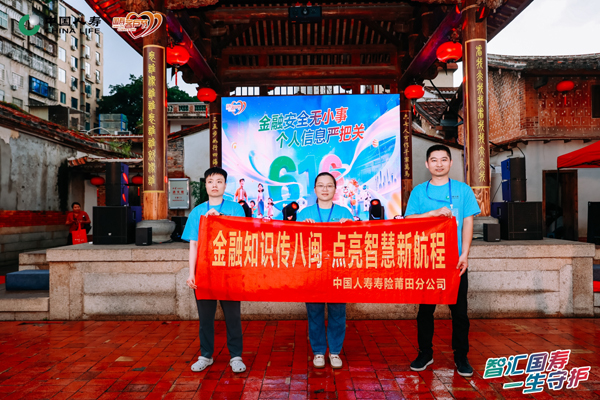 活动现场,古色古香的崇功祠前,中国人寿工作人员身着统一蓝色制服,手持印有“金融知识传八闽 点亮智慧新航程”标语的红色横幅,与背景中“金融安全无小事 个人信息严把关”的电子屏交相辉映。传统砖墙、红灯笼与木质楹联营造出浓厚的历史氛围,而金融知识宣传册、方言互动卡片等现代元素则赋予非遗街区新的时代内涵。