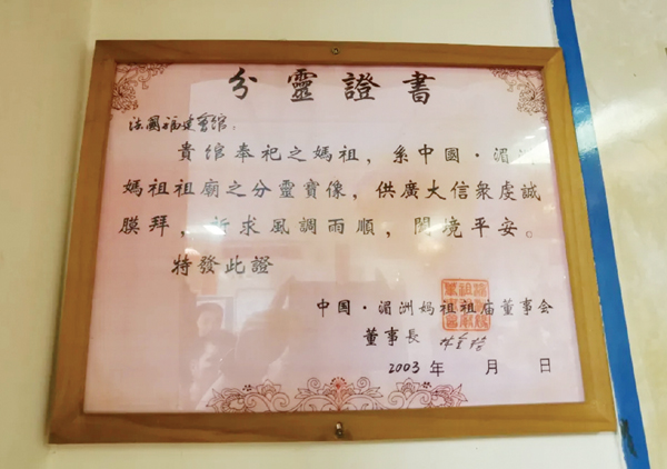 据了解,法国福建会馆是由一群出生在越南,祖籍福建的侨胞在法国谋生稳定后于20世纪70年代成立的。他们祖籍大多来自泉州和厦门,多次回中国探亲并到湄洲拜妈祖。本着共同的信仰,他们在戴英泰的倡议下,于2003年从湄洲祖庙分灵了一尊妈祖回法国供奉。每年春节,他们都会将妈祖请出来,在巴黎参加中国侨界社团组织的巡游活动。平常的每月初一、十五和三月廿三妈祖诞、六月十九观音诞,法国福建会馆的乡亲们都会集体举行供斋祈福仪式。