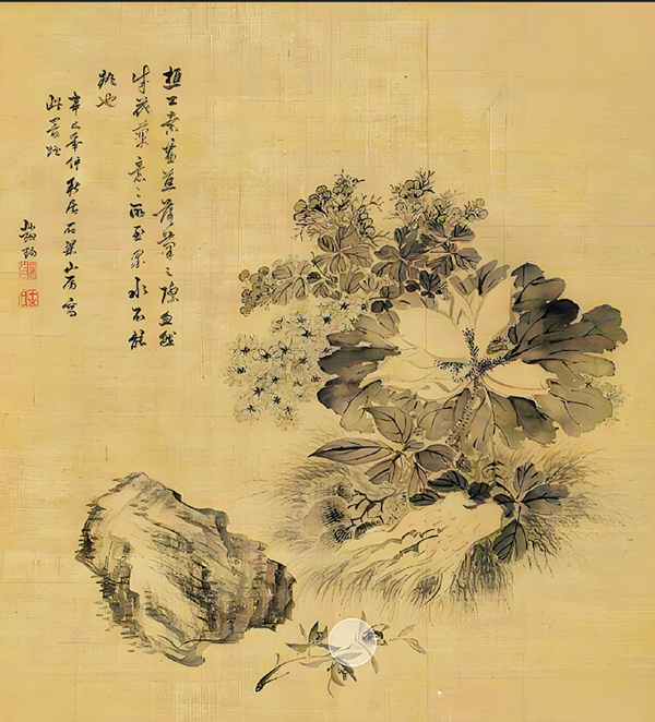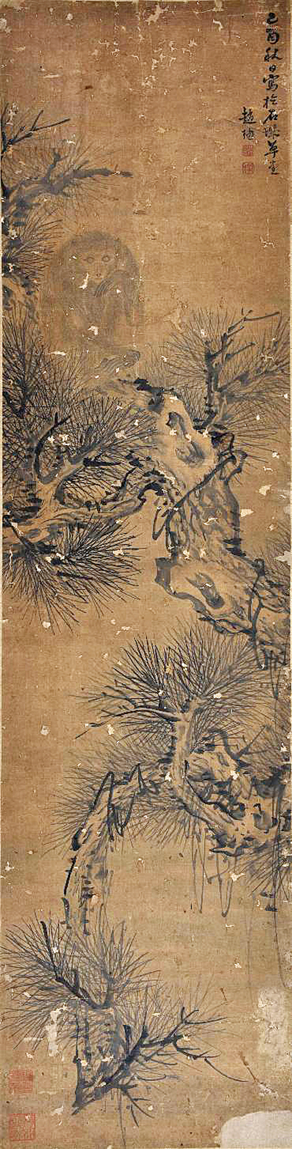 其次,赵珣热爱花鸟画创作,善写凫雁,娟秀可观,极飞鸣生动之致。在水墨写意创作领域,开创出适合自己的诗、书、画合璧之路。比如,明万历三十七年(1609),赵珣作《松猴图》,右上方落款“己酉秋日写于石城草堂,赵珣”,钤印二方“赵珣之印”“枝斯”,右下角钤印二方“碧藏楼章”“游定远收藏印”。明崇祯十四年(1641),赵珣作的《花果图》,以没骨与写意的技法结合,描绘了荷花、绣球、兰花、荔枝等不同季节的花果。诚然,赵珣择以枯木竹石为题材来创作,与其亲近、仰慕自然的文人情怀密不可分。张琴《题赵十五画枯木竹石图》:“疏篁与古木,幽意不可写。西湖风雨多,谁语伤心者?”《山与楼诗》卷三中清代林翰《题赵十五竹木图原跋云荒村僦居独与孤木疏篁相对春深如有所会因泼墨写此寄赠阿太社兄》:“枯木并修篁,付与村居者。此中着茅屋,幽意不可写。”《倦知楼诗》中载张培挺《题赵十五竹木图原跋云荒村僦居独与孤木疏篁相对春深如有所会因泼墨写此寄赠阿太社兄》:“当春写竹木,人画两绝俗。看君一幅图,定君终身局。”尽管赵珣的花鸟、山水画作数量不多,但每一件都体现了他在艺术上的精湛造诣和高超技巧。清代黄锡蕃《闽中书画录》卷四载:“……初治举子业,嗜古好奇,与时不合。遂弃去胸中磊砢之气,发之于诗歌,清幽激楚;兼爱写凫雁,沆漭中飞鸣生动;书亦娟韵可观。顾不乐以书画名当道,有求者非其意不肯作。……”事实上,赵珣性孤僻,不多为人作,唯山房寺壁则淋漓泼墨。周亮工《书影》卷四中载:“……所为《枯木竹石》,闽人珍之。然性孤僻,不多为人作。惟山房寺壁则淋漓泼墨,与叔度先后死。亦不能葬。存永因举十五之棺与叔度合葬于小西湖之侧。余为书碑,曰:‘明诗人陈叔度赵十五合墓。’”清代郑兆元《诗人墓》言:“栎园葬诗人,陈鸿赵十五。湖月照吟魂,寂寞一抔土。”郑兆元,字国仁,号春泉,侯官人。清乾隆三十六年(1771)举人,有《韵语偶存》。