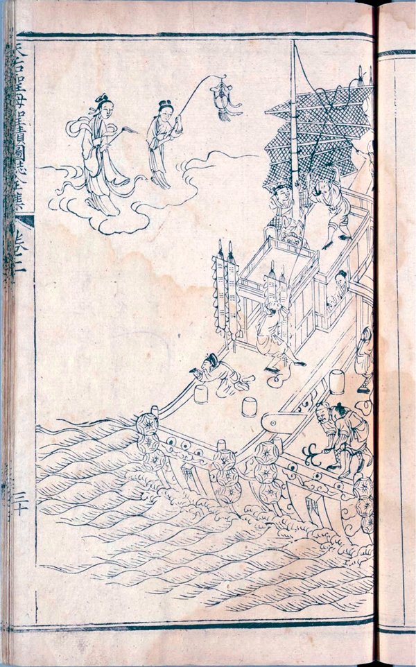 清代《天后圣母圣迹图志》中“垂神灯糧船有赖”载:“忽祥云霭霭,见空中朱衣拥盖,灯火垂光。既而风息,得获全安。奉旨赐额曰‘灵惠’。”图绘妈祖显圣,保护漕运中遇险粮船的场景。画面中漕运船遭遇大风,妈祖和手执神灯的侍从显现于空中,停在船前,船队转危为安。