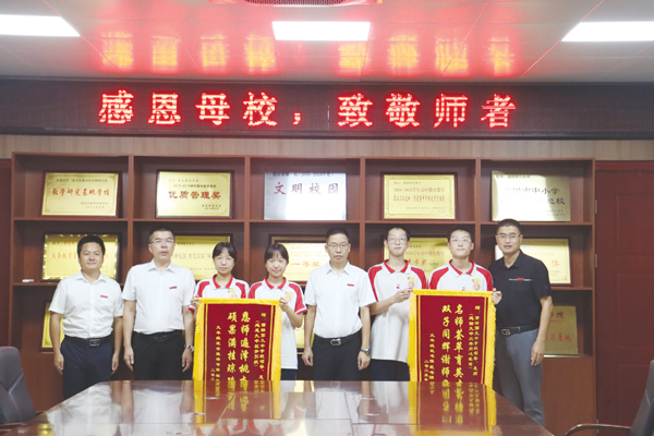 “名师荟萃育英才,双子同辉谢师恩”“师泽润桃李,硕果满挂琼枝”,两面锦旗,饱含着双胞胎们对老师的谢意,更传递着对母校的深情。感谢母校的教师以匠心育人,用耐心与专业,为学生铺就成长之路,以深厚底蕴,为学子搭建逐梦舞台。这一场双向奔赴的教育,在锦旗交接的瞬间,凝成最动人的教育篇章。