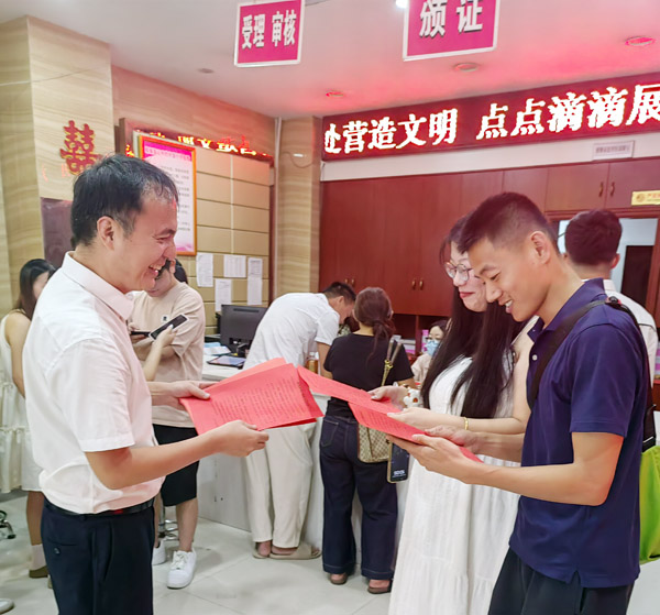 活动现场,每一对新人都能感受到细致的文化浸润。工作人员会主动上前,用通俗易懂的语言向前来登记的新人辅导婚前教育、婚姻家庭关系等知识,向新人细致宣讲“婚礼新办、喜事简办”的新风尚,让新人在等待登记的间隙,引导新人树立正确的婚恋观、家庭观,正确认识和对待婚姻,提醒大家远离“天价彩礼”“低俗婚闹”等陈规陋习。登记完成后,在工作人员的指引下,新人进行庄重的颁证与宣誓,让“责任与守护”的婚姻内核深入人心。同时,工作人员还为登记的新人拍摄照片、视频,为新人们留下这一美好瞬间。