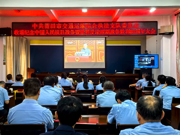 9月3日上午9点,莆田市交通运输综合执法支队组织全体执法人员,集中观看《纪念中国人民抗日战争暨世界反法西斯战争胜利80周年大会》,共同回忆波澜壮阔的抗战历史,缅怀革命先烈,传承伟大抗战精神。