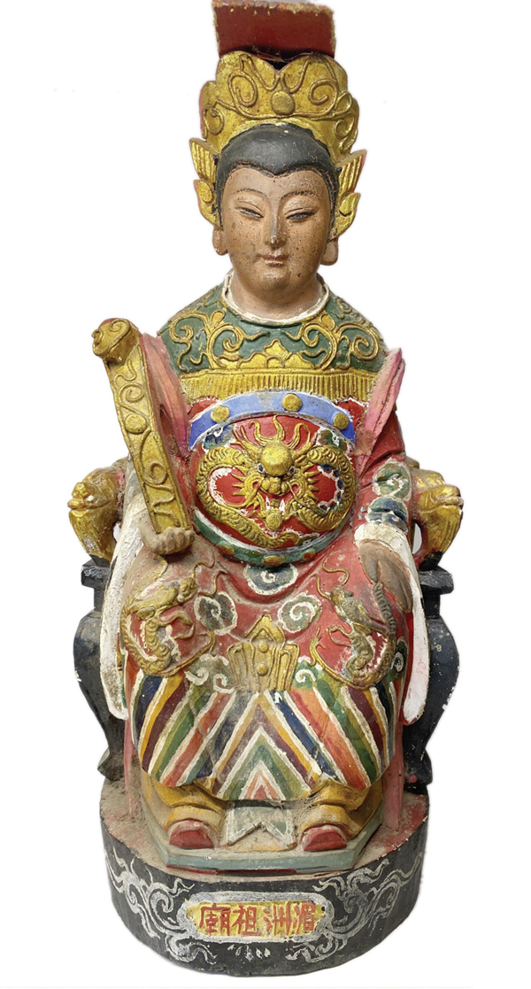 诚然,底座镌刻“湄洲祖庙”四个字,不仅是对神像归属的标注,也体现出历史与地域的文化符号。带有这一标识的妈祖像,承担着文化纽带的作用。如有尊底座刻有“湄洲祖庙”,袍服的黄色绸带上注有“岁次丁卯年九月九日往湄洲祖庙进香 恭迎天上圣母纪念妈祖成道一千周年”的妈祖像,阐明了1987年农历九月初九日,台湾台中大甲镇澜宫组团到湄洲祖庙参加纪念妈祖升天一千周年活动的史况。