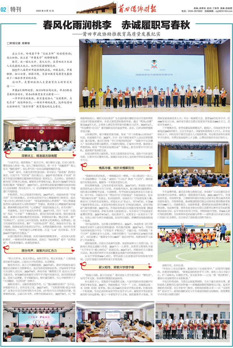 一串串详实的数据,彰显着政协人“为国履职、为民尽责”的使命担当;一项项丰硕的成果,托举起莆田打造新时代“海滨邹鲁”教育高地的无上荣光。