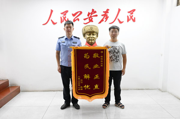 为表示感谢,陈先生将一面“敬业正直 为民解忧”的致谢锦旗送至镇海派出所,对民警尽心尽责的工作态度给予高度肯定。(陈娟)