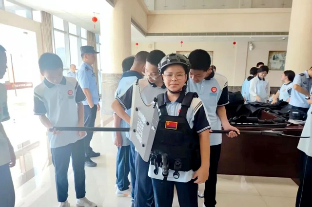 活动中,该院法警大队副队长杨智雄警官带领学生们走进警用装备展示区,细致讲解手铐、警棍、防刺背心等装备的功能与使用规范。在确保安全的前提下,邀请学生亲手触摸、佩戴装备,亲身感受司法警察的工作日常,现场互动氛围热烈。随后,立案庭讲解员全程引导学生参观立案大厅、审判庭等场所,结合生动案例,清晰拆解“立案—审理—执行”全流程,从如何提交诉讼材料,到法官如何开庭审理,再到判决生效后如何执行,每个环节都讲解得通俗易懂,学生们对法院职能有了全面的认识。