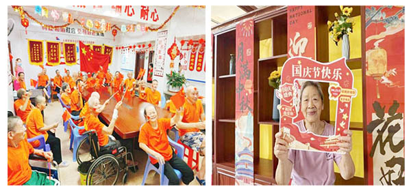 敬老院里的双节同样热闹。华亭镇幸福疗养院摆起团圆宴,分月饼、邀家属,长者们和亲人围坐唠家常;灵川镇幸福养护院的活动室里,《义勇军进行曲》歌声嘹亮,长者与护理员齐声合唱,爱国情怀满溢;多福颐养院专门设下国庆拍照墙,老人们戴着小红花、举着祝福牌,在镜头前留下灿烂笑容,院里还贴心准备了低糖月饼、桂花糕,既合节日口味,又护饮食安全。