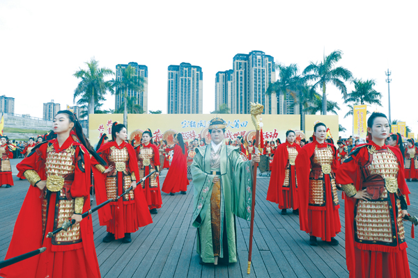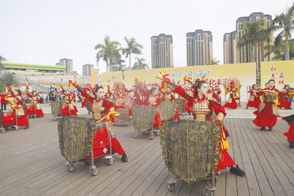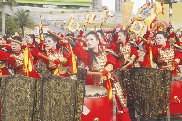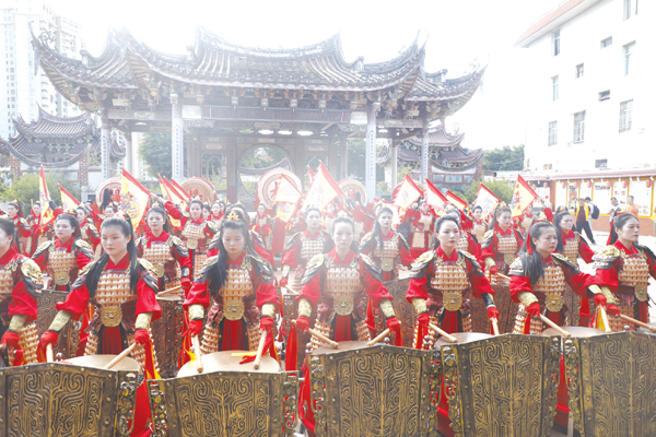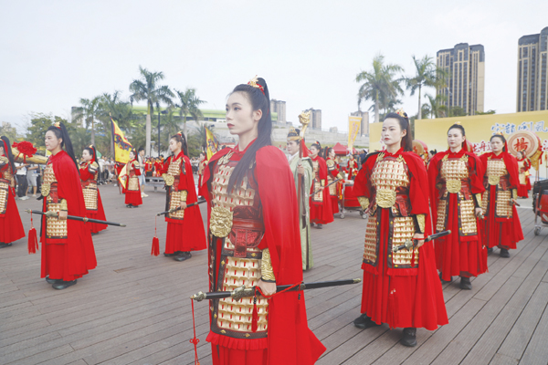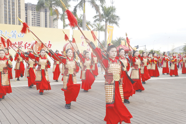 超百人的表演队伍现场献演,队员中,或举红缨枪,或执锤击鼓,或挥舞令旗,随着鼓点节奏的变化,队形应声也随之不断变换,瞬间犹如化作一股红色的激流,穿插、环绕……,看得人眼花缭乱。队员们时而如长蛇盘绕,首尾相衔;时而如雁阵斜掠,层次分明,每一次完美变阵,配合的严丝合缝,都会赢得现场观众阵阵热烈的掌声与喝彩声。“表演太精彩了,这些‘巾帼英雄’配合也十分默契,让人有一种穿越到古战场的感觉,那千军万马当的气势令人特别震撼。”特地携家人从厦门过来的游客朱先生说。