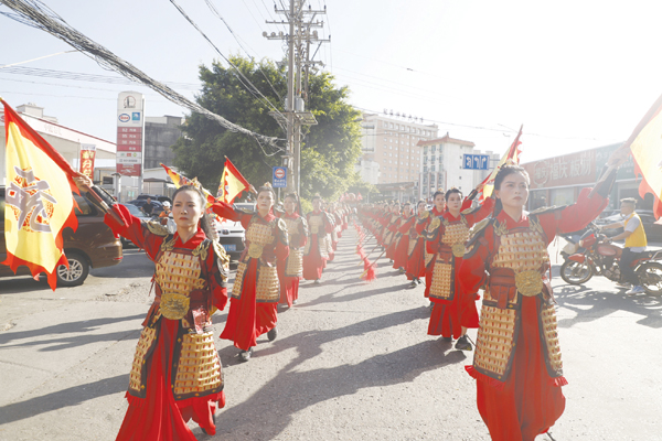 据了解,穀城宫百人“杨门女将”团队是由黄石镇穀城宫董事会于今年6月份牵头组织成立,目前有表演队员107人,全部为女性,平均年龄37岁。“近年来,随着穀城宫在海内外名声和影响力不断扩大,接待来自台湾等地的进香团队已然成为常态化,成立一支具有历史故事、观赏性的民俗表演队便摆在大家面前,经过多次讨论,还是无法定下,在一次午休时,我突然想到穀城宫是供奉北宋年间抗辽的杨家名将,于是就有了成立‘杨门女将’的想法,这一提议也得到了集体的支持。”黄石镇穀城宫董事会董事长张志华告诉记者。