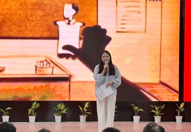 比赛中,7位参赛教师依次登台,结合一线教学经历展开生动讲述。他们从课堂讲解、课后陪伴、师生互动等场景出发,用纸条故事诠释倾听与尊重,以“扎根”“坚守”表达教育赤诚,借“师者如光”传递育人力量。真挚的感悟和鲜活的案例引发全场共鸣,掌声不断。